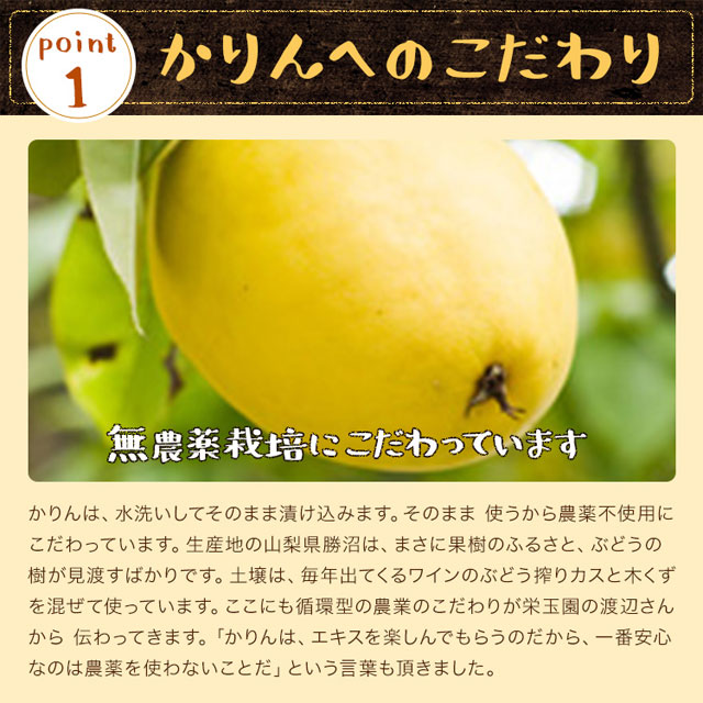 かりんは、水洗いしてそのまま漬け込みます。そのまま使うから農薬不使用にこだわっています。生産地の山梨県勝沼は、まさに果樹のふるさと、ぶどうの樹が見渡すばかりです。土壌は、毎年出てくるワインのぶどう搾りカスと木くずを混ぜて使っています。ここにも循環型の農業のこだわりが栄玉園の渡辺さんから伝わってきます。「かりんは、エキスを楽しんでもらうのだから、一番安心なのは農薬を使わないことだ」という言葉も頂きました。