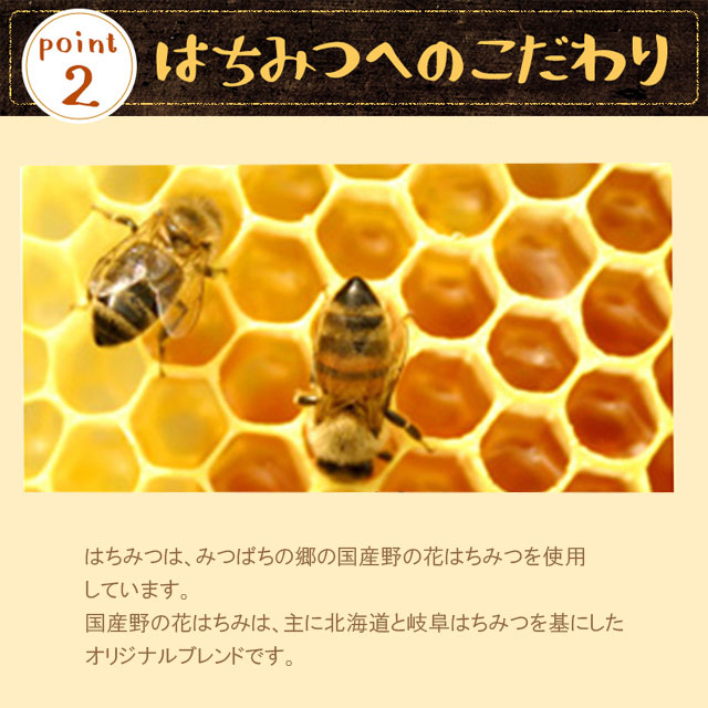 はちみつは、みつばちの郷の国産野の花はちみつを使用しています。国産野の花はちみつは、主に北海道と岐阜のはちみつを基にしたオリジナルブレンドです。