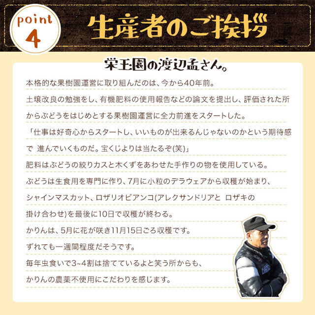 生産者は、栄玉園の渡辺さん。本格的な果樹園運営に取り組んだのは、今から40年前。