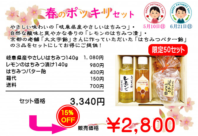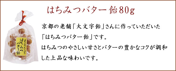 使いやすく、やさしい味わい「岐阜県産やさしいはちみつ140g」、自然の酸味と爽やかな香り「レモンのはちみつ漬140g」、京都の老舗「大文字飴」さんに作っていただいた「はちみつバター飴80g」のセットです。